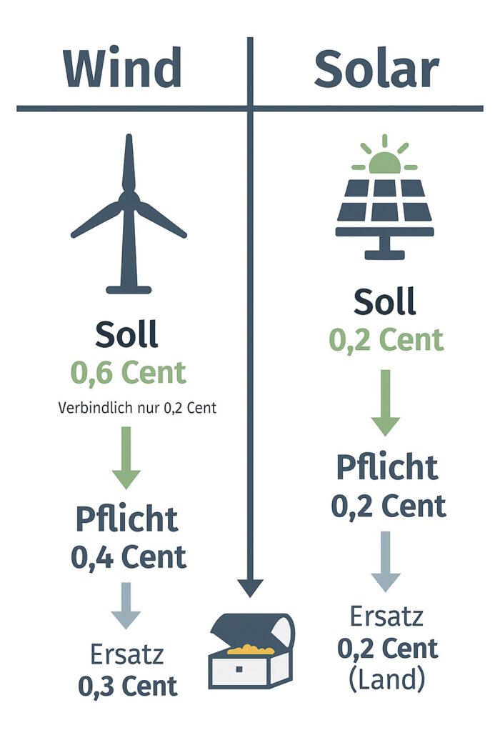 Nach dem jetzigen Entwurf des Bürgerbeteiligungsgesetzes 2.0 gilt eine klare Regel: Innerhalb von zwölf Monaten nach Genehmigung einer Anlage müssen Betreiber und Gemeinden eine Beteiligungsvereinbarung schließen. Bei Windrädern sind alle Gemeinden im Umkreis von 2,5 Kilometern beteiligt, bei Solarparks nur die Standortgemeinde. Kommt keine Einigung zustande, greift die Ersatzzahlung an das Land, die in ein Sondervermögen fließt und über den Landkreis verteilt wird – nach einem gestellten ANTRAG der Gemeinde- Bürger profitieren dann nicht direkt.