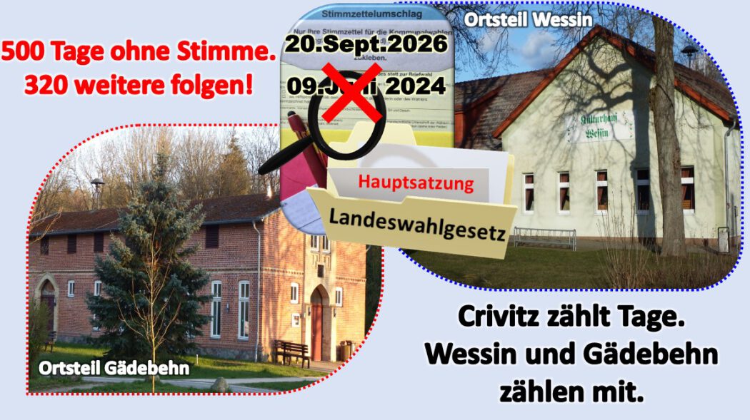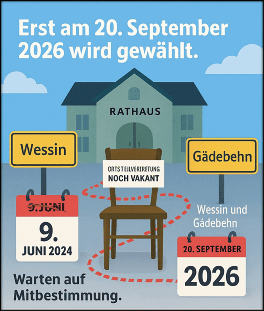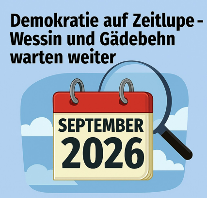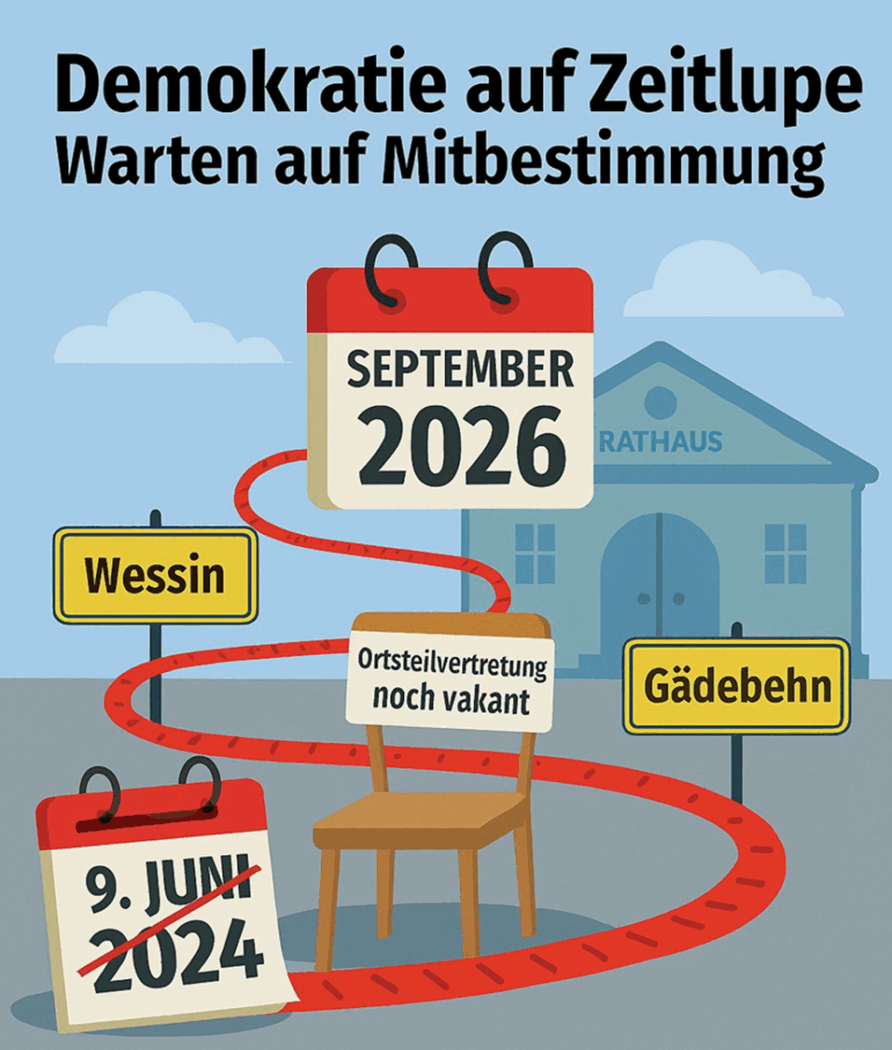 Es gibt diese besonderen Momente in der Kommunalpolitik, in denen man sich fragt, ob die Uhr nicht nur langsam tickt, sondern ob sie schlicht den Dienst quittiert hat. Genau so wirkt es derzeit in Crivitz, wo die Bürgerinnen und Bürger der Ortsteile Wessin und Gädebehn seit über 500 Tagen geduldig auf ihre demokratisch gewählten Ortsteilvertretungen warten – und nun erfahren mussten, dass sie noch weitere 320 Tage Geduld aufbringen sollen. Wie in der Stadtvertretersitzung am 27. Oktober 2025 verkündet wurde, soll die direkte Wahl der Ortsteilvertretungen erst am 20. September 2026 stattfinden. Das ist nicht weniger als zwei Jahre und drei Monate nach der Kommunalwahl 2024. Man könnte sagen: Demokratie braucht hier nicht nur einen langen Atem, sondern auch ein bequemes Sitzkissen und eine Thermoskanne für die Wartezeit.