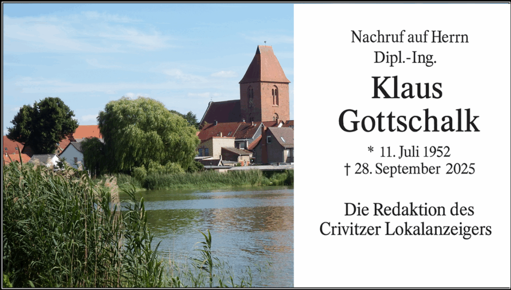 Mit großer Betroffenheit und aufrichtiger Anteilnahme möchten wir, die Redaktion des Crivitzer Lokalanzeigers, an dieser Stelle das nachholen, was in der öffentlichen Würdigung bislang versäumt wurde: einen ehrenden Nachruf auf Klaus Gottschalk, der am 28. September 2025 im Alter von 73 Jahren verstorben ist.