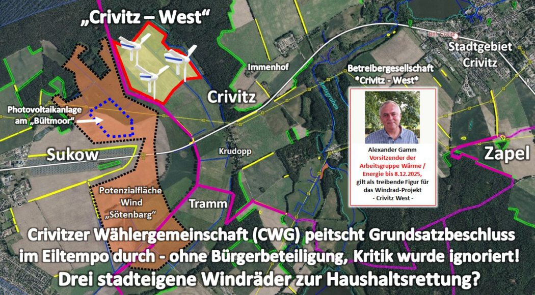 Es war ein Abend, der in Erinnerung bleiben wird. Nicht wegen der Windräder. Sondern wegen der Art und Weise, wie Politik in Crivitz gemacht wurde – und wegen der Rolle eines Mannes, der an diesem Abend deutlicher denn je zeigte, wie viel Macht man haben kann, wenn man gleichzeitig Bauausschussmitglied, Fraktionsmann der CWG‑Crivitz, Ehemann der Bürgermeisterin und selbsternannter Experte für Wärme und Energie ist.