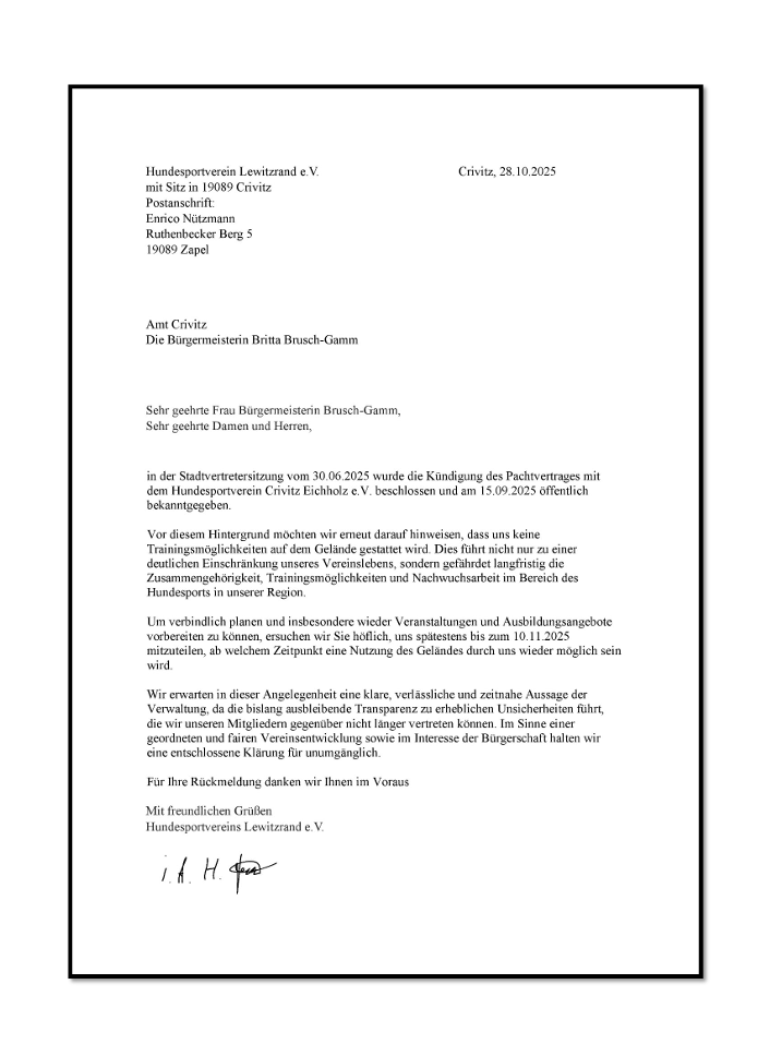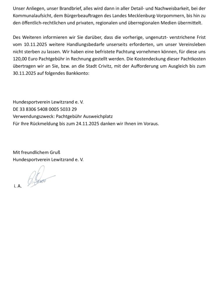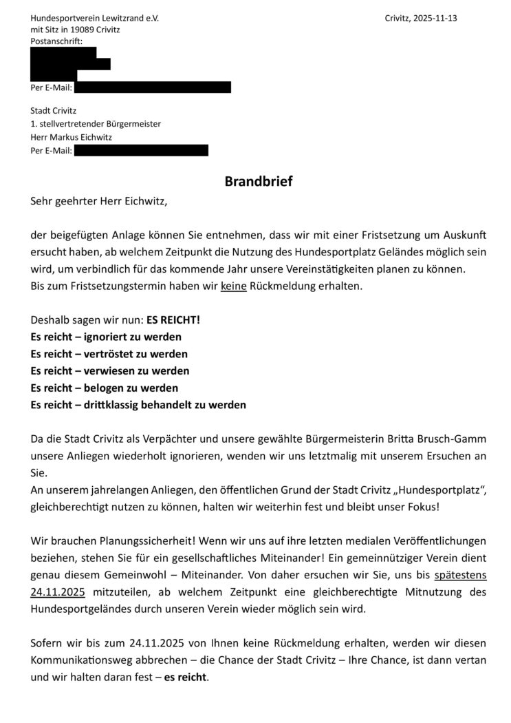 Im November 2025 – der Brandbrief des Hundesportvereins Lewitzrand e.V. an Herrn Eichwitz : „Es reicht“