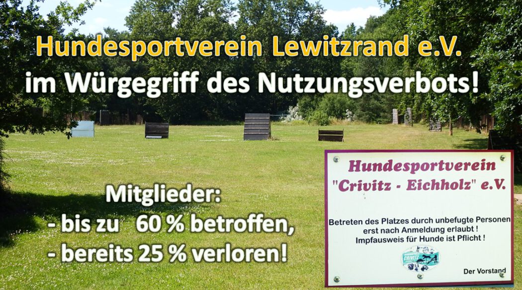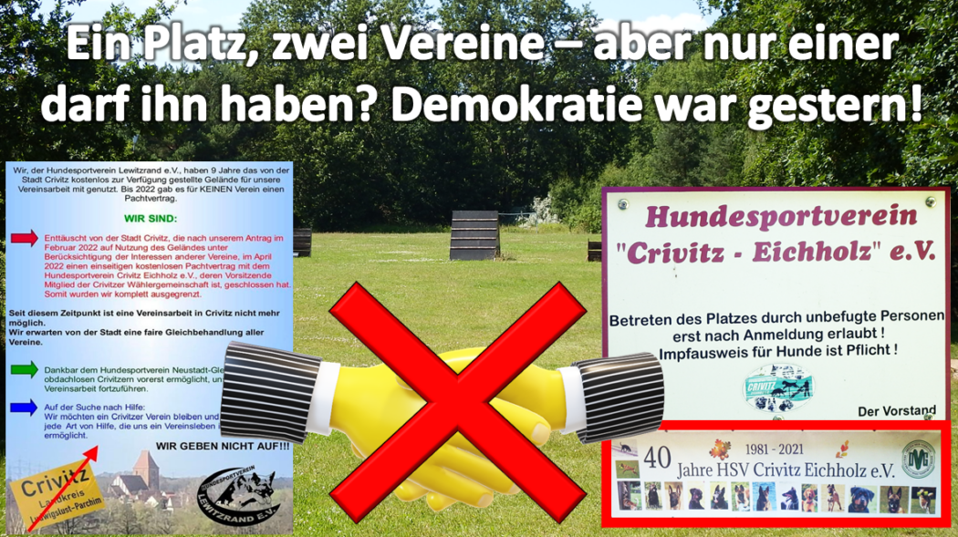 Der Hundesportplatz ist eine öffentliche Fläche der Stadt Crivitz. Dennoch wurde er über einen Pachtvertrag an den HSV Crivitz Eichholz e.V. vergeben. Besonders brisant: Der Vertrag enthält eine Klausel, nach der der Pächter anderen eine Mitnutzung erlauben kann – oder eben nicht. Genau diese Möglichkeit wird gegenüber dem Hundesportverein Lewitzrand e.V. bis heute nicht vollständig angewandt. Damit werden bis zu 60 % der Mitglieder des Hundesportverein Lewitzrand e.V. faktisch ausgeschlossen.