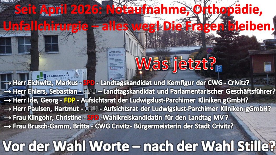 Und genau deshalb bleiben die entscheidenden Fragen offen: Wie sicher ist die Versorgung jetzt? Wie lange dauern Wege im Ernstfall? Wohin fährt der Rettungsdienst? Crivitz braucht Antworten. Nicht irgendwann. Sondern jetzt.