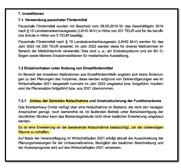 Zusätzlich waren 242.000 Euro für bauliche Instandhaltung, 199.000 Euro für die Wartung der Medizintechnik, 100.000 Euro für EDV‑Umstrukturierung, 150.000 Euro für Planungsleistungen nicht förderfähiger Bereiche und 3,225 Millionen Euro für Gesamtinvestitionen im Jahr 2022 vorgesehen. Nichts deutete darauf hin, dass dieser Bereich nur wenige Jahre später geschlossen werden würde.