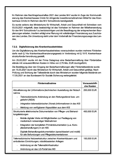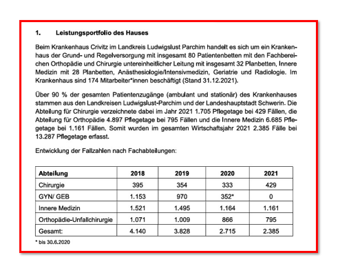 Die Rekommunalisierung des Krankenhauses am Crivitzer See im Jahr 2021 war ein politisch bedeutsamer Schritt, getragen vom Landkreis Ludwigslust‑Parchim, der Verantwortung übernahm, Stabilität versprach und Modernisierung ankündigte. Im Wirtschaftsplan 2022 wurde das Krankenhaus als Haus der Grund- und Regelversorgung beschrieben, mit einer Notaufnahme, die nicht nur erhalten, sondern erweitert werden sollte. Für die bauliche Erweiterung der Notaufnahme waren bereits Planungsmittel eingestellt, die Maßnahme sollte vollständig aus Landesmitteln finanziert werden.Allein für die Digitalisierung der Notaufnahme wurden 250.000 Euro veranschlagt, darunter die telemedizinische Anbindung an den Rettungsdienst, die Integration digitaler Vorabinformationen in das Krankenhausinformationssystem und die Meldung verfügbarer Kapazitäten.