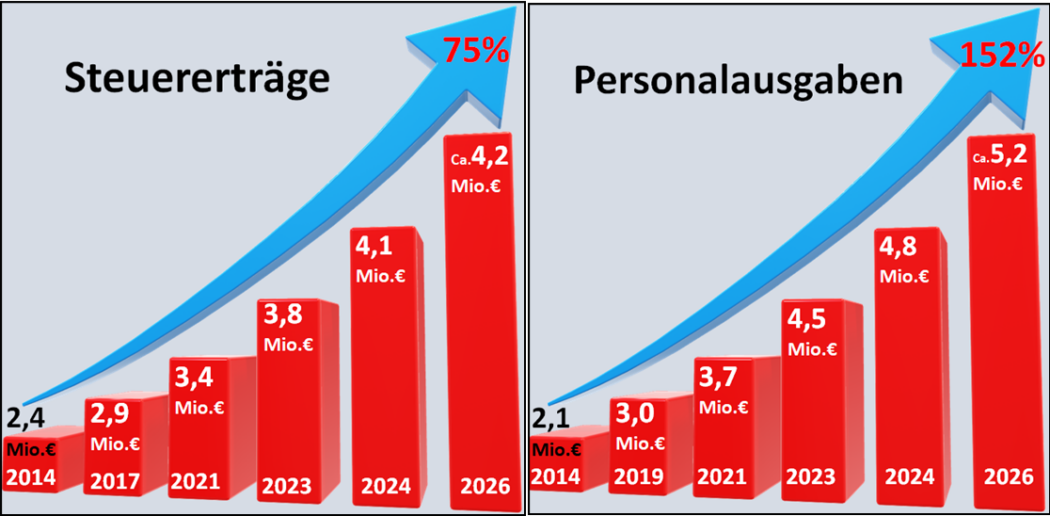 Die Steuereinnahmen stiegen im selben Zeitraum zwar von 2,4 Mio. € auf etwa 4,2 Mio. €, doch sie decken im Jahr 2026 nicht einmal mehr die Personalkosten.