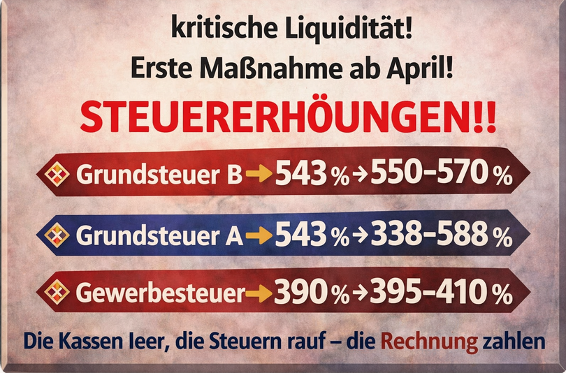 Diese Zahlen stehen schwarz auf weiß in der Vorlage – und sie treffen direkt die Bürgerinnen und Bürger, die Grundstücksbesitzer, Vermieter und Unternehmen. Für viele wirkt es wie ein Paukenschlag: Kaum eine Woche nach der Offenlegung der Zahlungsprobleme sollen nun die Steuern steigen.