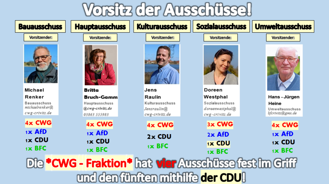 Die Reaktionen im Saal kamen nicht aus dem Nichts. Viele Bürger berichten seit Jahren von immer gleichen Mustern der CWG – Crivitz als Fraktion auf Stadtvertretersitzungen und CWG – dominierenden Ausschüssen im politischen Alltag der Stadt: