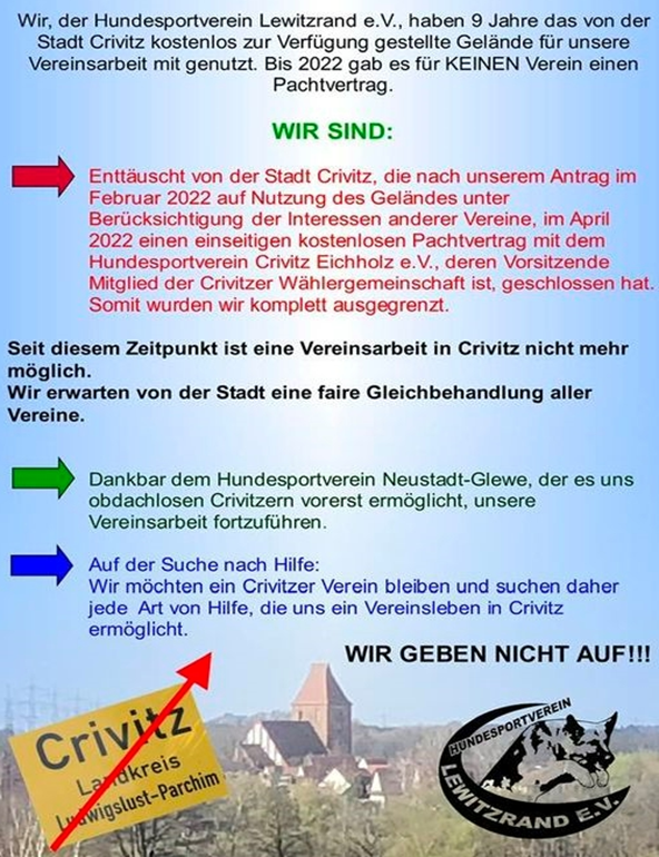 In Crivitz hat sich über mehrere Jahre hinweg ein Konflikt entwickelt, der weit über die Frage hinausgeht, welcher Hundesportverein welchen Platz nutzen darf. Was als einfache Verwaltungsangelegenheit begann, hat sich zu einem komplexen Geflecht aus politischen Entscheidungen, Machtstrukturen, persönlichen Verstrickungen, dem Umgang mit Kritik, fehlender Transparenz, widersprüchlichen Aussagen und wachsender Frustration unter den Bürgerinnen und Bürgern entwickelt. Im Zentrum stehen zwei Vereine: der Hundesportverein Lewitzrand e.V. und der HSV Crivitz Eichholz e.V. Während letzterer den Hundesportplatz exklusiv nutzt, kämpft der Lewitzrand-Verein seit Jahren darum, diesen öffentlichen Grund der Stadt Crivitz wieder mitnutzen zu dürfen. Der Platz gehört der Stadt – doch faktisch ist er für einen Teil der Hundesportler verschlossen.