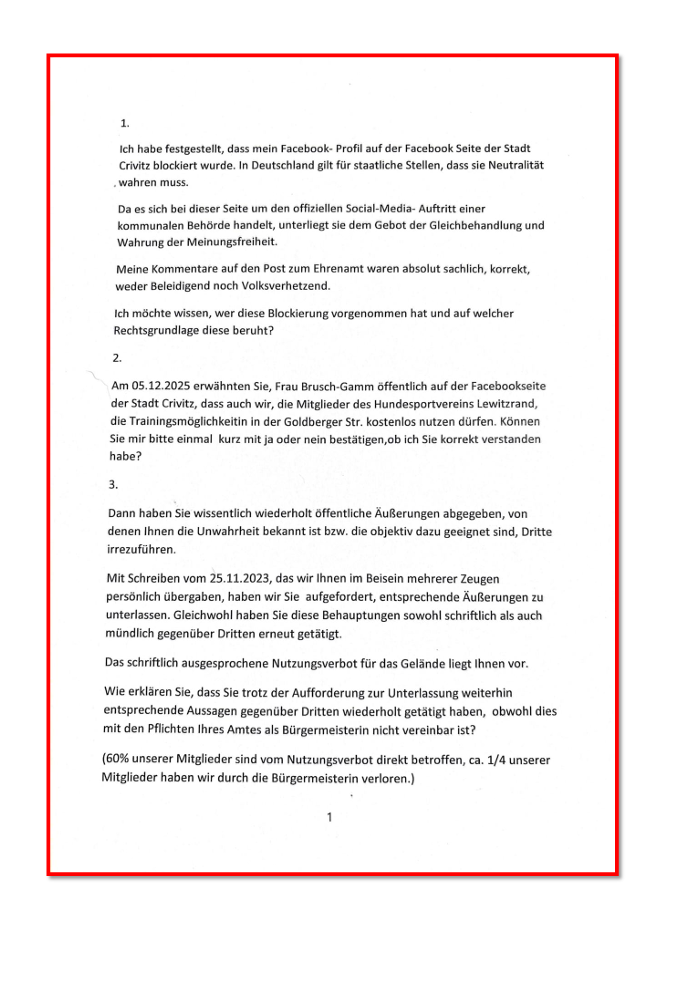 Ein Vorstandsmitglied Frau Heike Jarchow schilderte, dass ihr persönliches Profil auf der offiziellen Facebook-Seite der Stadt Crivitz blockiert worden sei. Sie wies darauf hin, dass es sich bei dieser Seite um den Auftritt einer kommunalen Behörde handelt, die dem Gebot der Neutralität und Gleichbehandlung unterliegt. Ihre Kommentare seien sachlich gewesen, weder beleidigend noch hetzerisch. Die Frage lautete: Wer hat die Blockierung veranlasst – und auf welcher Rechtsgrundlage? Die Bürgermeisterin Britta Brusch-Gamm (CWG-Crivitz) erklärte daraufhin, sie habe die Blockierung selbst veranlasst, weil die Antworten des Hundesportvereins aus ihrer Sicht „der Ehrung der Stadt nicht entsprochen“ hätten.