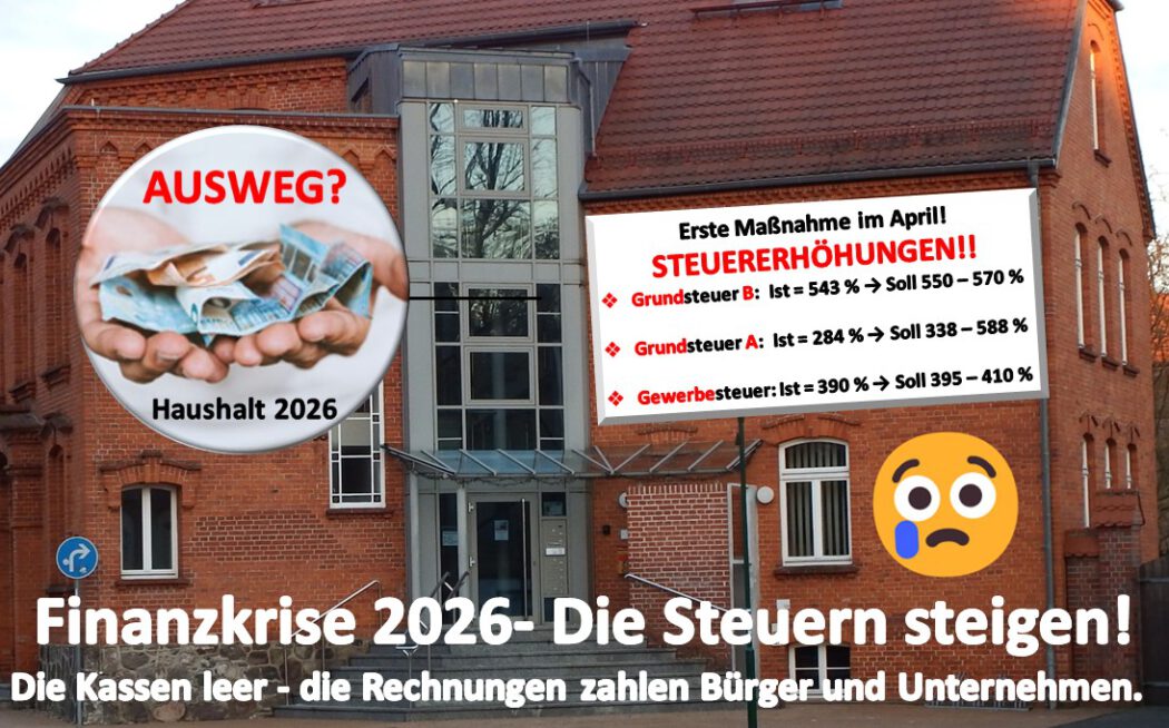 Mit der Veröffentlichung der Tagesordnung für die Stadtvertretungssitzung am 23. April 2026 wird deutlich: Die Stadtspitze plant Steuererhöhungen – sofort, ohne Vorberatung, ohne Ausschussberatungen, ohne öffentliche Diskussion. Ein Schritt, der zeigt, wie ernst die Lage ist – und wie wenig Zeit offenbar bleibt.