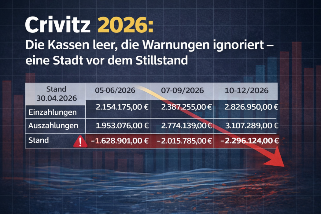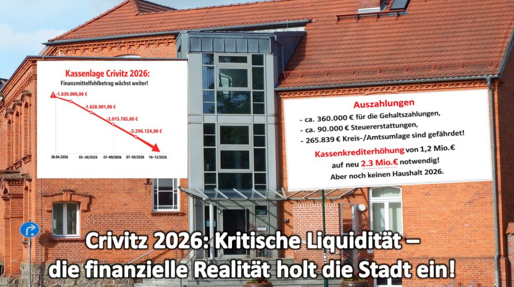 Crivitz steht im Frühjahr 2026 an einem finanziellen Abgrund. Die Stadt ist ohne neue Kassenkredite nicht mehr zahlungsfähig, die Rücklagen sind aufgebraucht, die Liquidität erschöpft, der Haushalt 2026 nicht in Sicht. Die Warnungen der vergangenen Jahre wurden nicht ausreichend berücksichtigt, und die Folgen sind nun für alle sichtbar. Die kommenden Wochen entscheiden darüber, ob Crivitz den Weg zurück in die finanzielle Stabilität findet – oder ob die Stadt weiter in die Handlungsunfähigkeit rutscht. Klar ist: Ohne ehrliche Analyse, klare Prioritäten und konsequente Entscheidungen wird es keinen Weg aus dieser Krise geben.