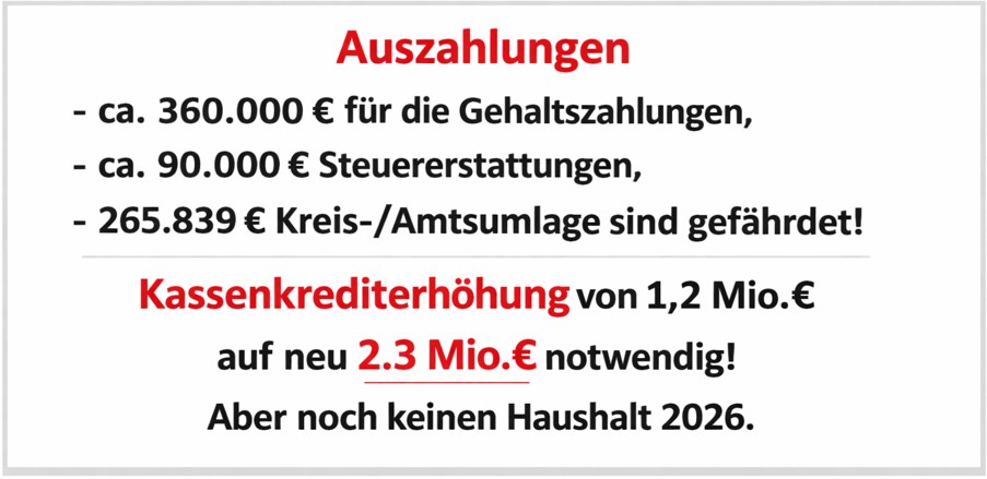 Die Stadt ist nicht mehr in der Lage, ihre Rechnungen zu bezahlen. Bis Ende April stehen Zahlungen von rund 1,2 Millionen Euro an – Gehälter, Umlagen, Steuererstattungen, Rechnungen für Bauleistungen, die längst erbracht wurden. Dem gegenüber stehen nur etwa 330.000,00 € an Einnahmen. Die Verwaltung rechnet vor, dass der zulässige Kassenkredit bis Ende April um ca. 600.000,00 € überschritten würde. In einer nüchternen Tabelle steht, dass der Finanzmittelfehlbetrag zum 30. April bei minus 1,83 Millionen Euro liegen wird – und im weiteren Jahresverlauf sogar auf über minus 2,3 Millionen Euro anwachsen könnte.