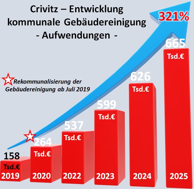 Ab 2022 betragen die Jährlichen Abschreibungen insgesamt 1.056.600,00€, welche erwirtschaftet werden müssen. Die Repräsentation-saufwendungen der Stadt Crivitz betragen 2021 = 64.100,00€, davon entfallen alleine 8.000,00€ nur für die Bürgermeisterin! Die Kosten für die Gebäudereinigung betrugen in der Fremdreinigung im Jahr 2019 betrugen 223.972,02 € dagegen die sind Kosten für die jetzigen Eigen-reinigung 2021 auf 348.300€ angestiegen. Tendenz weiter steigend!
