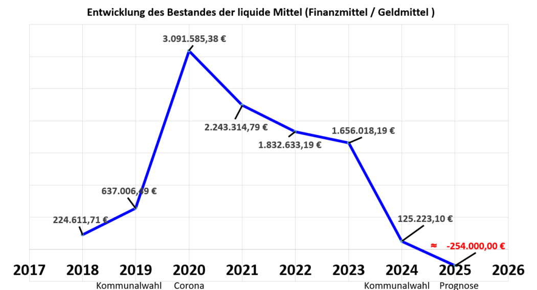 2025 zeigte die Haushaltssatzung dann erstmals schwarz auf weiß, wie tief das strukturelle Defizit wirklich war: Erträge von 12,5 Millionen Euro standen Aufwendungen von 14,5 Millionen Euro gegenüber, der laufende Fehlbetrag lag bei über 1,6 Millionen Euro, und die Kommunalaufsicht reagierte mit harten Auflagen, versagte die volle Genehmigung des Kassenkredits und verlangte eine Verbesserung des Haushalts um über 800.000 €( KÜRZUNGEN/EINSPARUNGEN). Doch obwohl die Lage ernst war, obwohl klar war, dass die Stadt auf eine finanzielle Wand zusteuert, blieb der finanzpolitische Kurs weitgehend unverändert.