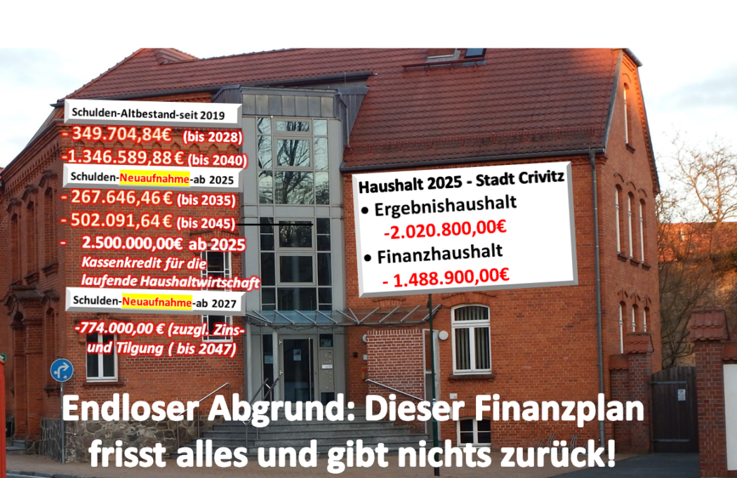 Die Stadt Crivitz steht im Herbst 2025 am haushaltspolitischen Abgrund – und das ist keine Übertreibung. Was im Frühjahr 2025 mit einem dramatischen Titel begann – „Haushaltsplan des Grauens: Geld, das schneller verdampft als kochendes Wasser!“ – hat sich bis zum Herbst zu einer haushaltspolitischen Krise verdichtet, die Crivitz noch Jahre beschäftigen wird.